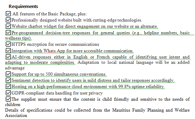 The Mauritius Family Planning and Welfare Association (MFPWA), with the support of the European Union. invites proposals for the production of a web based solution which can be integrated on whatsapp on key topics targeted at adolescents and youths aged 10-18 years. The WebBotics Advanced Website & Chatbot Package is designed to operate within a highly scalable and resilient cloud infrastructure, ensuring optimal performance, security and compliance.